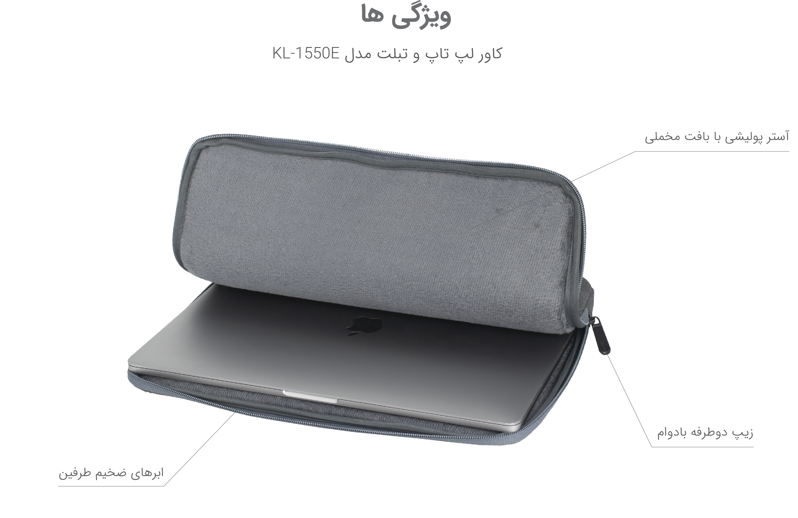 کاور لپ تاپ و تبلت مدل 1550E سری EVO که بر اساس ابعاد صفحه نمایش دستگاهی که درون آنها جای می گیرد با نامهای KL-1550E/KL1450E/KL1350E/KL1250E/KL1050E شناخته می شوند، از مواد با کیفیت بالا و مرغوب ساخته شده و دارای طراحی کاربردی، مینیمال و در عین حال ارگونومیک است.